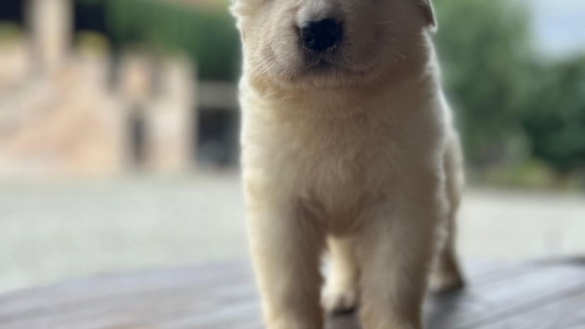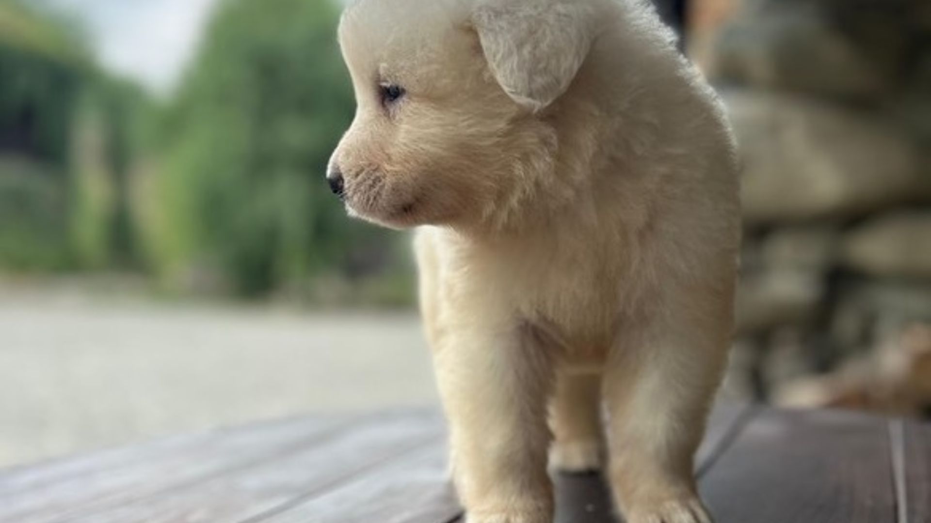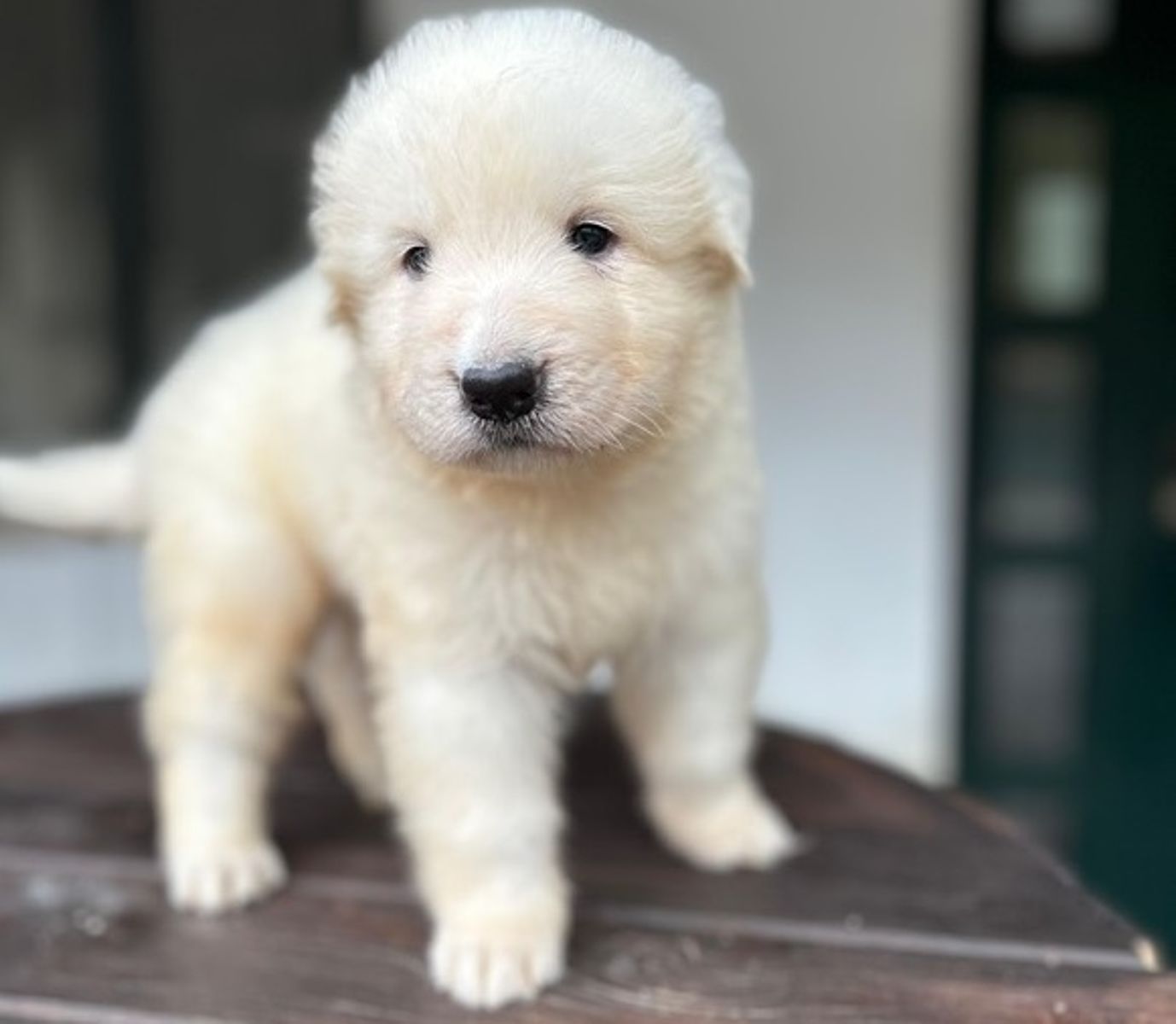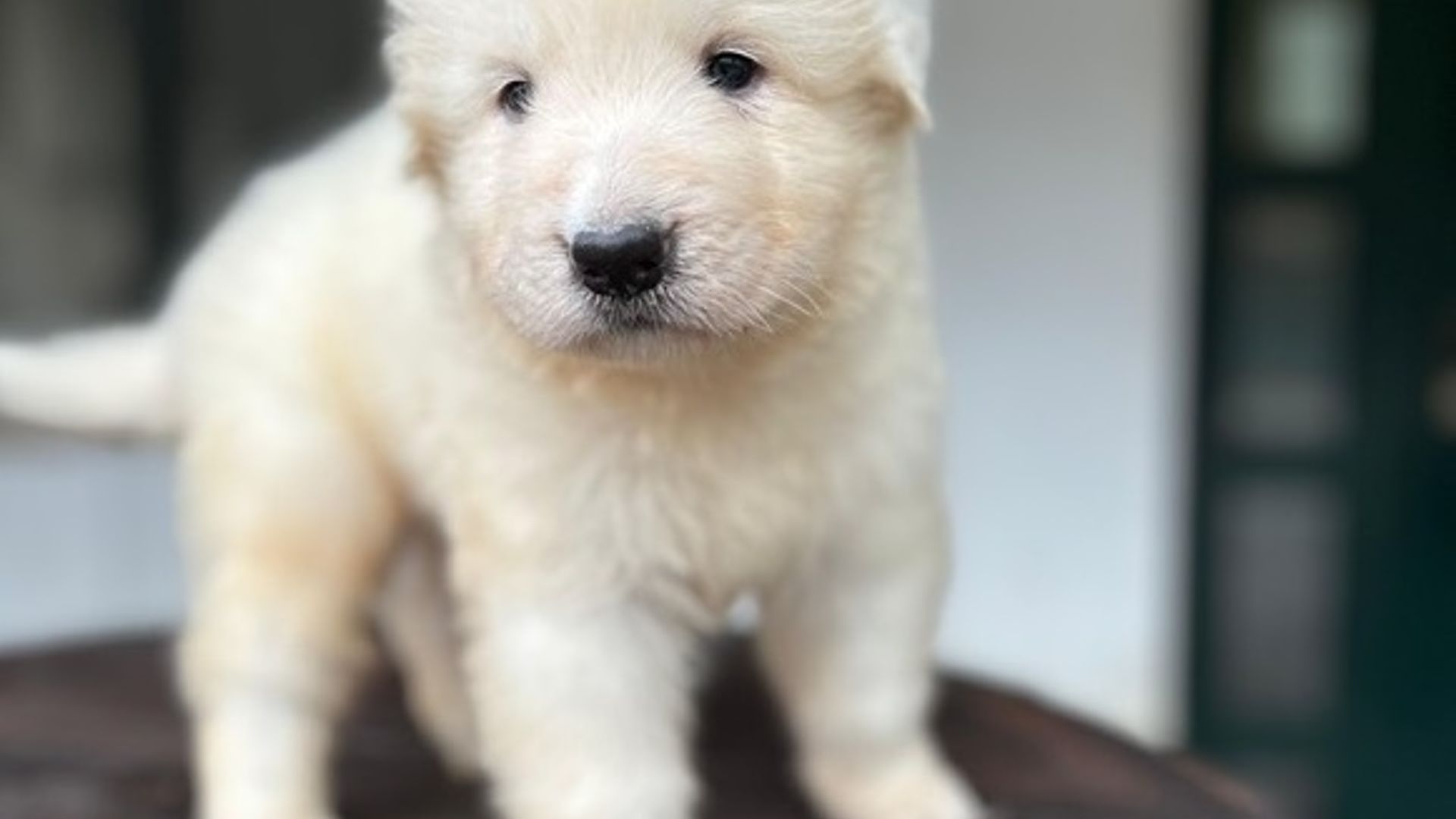 Il pelo, seppur ancora morbido e tipicamente da cucciolo, è fitto e già mostra la tessitura che diventerà semiruvida in età adulta. Colore bianco puro, senza macchie evidenti.